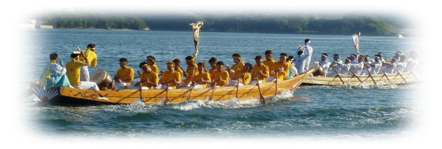 各地区の櫂伝馬船が 一斉に海に漕ぎ出します。太鼓を鳴らし、子どもたちの采振りと乱れることのない櫂さばき・・・練習を重ねた証です。